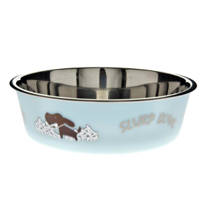 Ferribiella ciotola Fuss-Bella è una ciotola in acciaio inox con la parte estena decorata e colorata con il cagnolino del marchio Ferribiella e la scritta "Slurp Bowl".