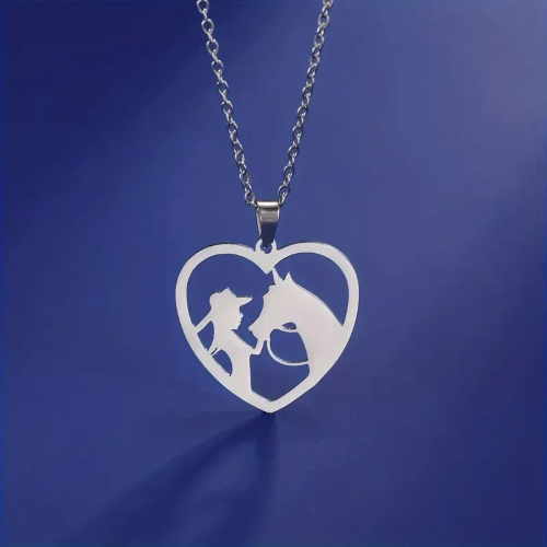 Collana con ciondolo raffigurante una ragazza che abbraccia ed accarezza il suo cavallo.